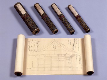 記錄了建築各部分尺寸的方法(木割術)的秘傳書形式的卷軸。這是傳到江戶幕府小建築方棟梁柏木家的奧書,1689年(1689年)伊兵衛政等向太郎右衛門政虎傳授。全五卷由“御所大人”、“神社之部”、“佛殿之部”、“門之部”、“塔之部”構成,是了解江戶時代建築技術和木匠組織的重要資料。