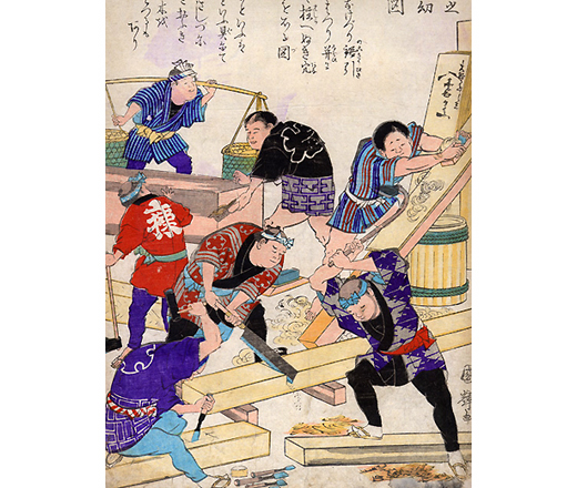 作為面向學童的解說圖,明治初年文部省出版的圖集。生動地描繪了江戶末期到明治初期的工匠們的樣子。描繪了木鋸使用前鋸大鋸製作的樣子和木匠在角材上塗墨的樣子。