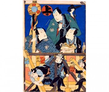 以雙六形式描繪了上梁的樣子的多色印刷木版畫。全部5張中的1張。可以理解江戶時代木匠的風俗。下部描繪了建方(組裝)的樣子,上部描繪了舉行儀式的木匠的樣子。