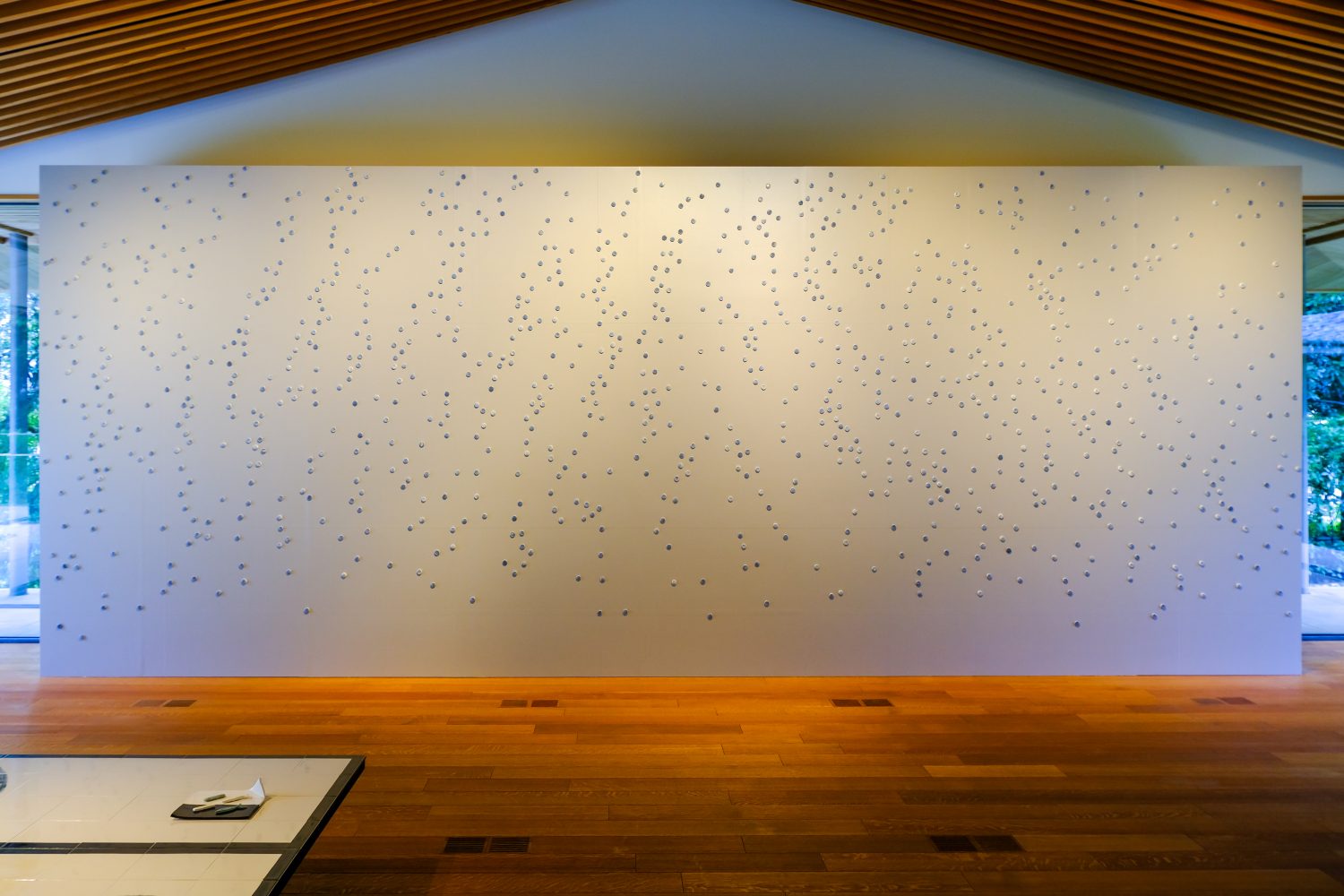 ![]() 最裡面的牆面上也有大作“水滴”散落在牆上。作者說,在豪雨引起世間的騷動中,想表現自古以來濕潤的雨。 |