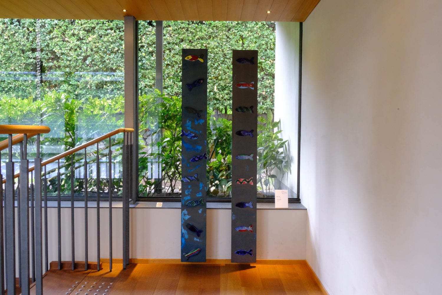 ![]() 在下B1F途中的舞場裡,可以用可愛的魚的瓷磚作品《想玩的魚》來迎接我們。 |