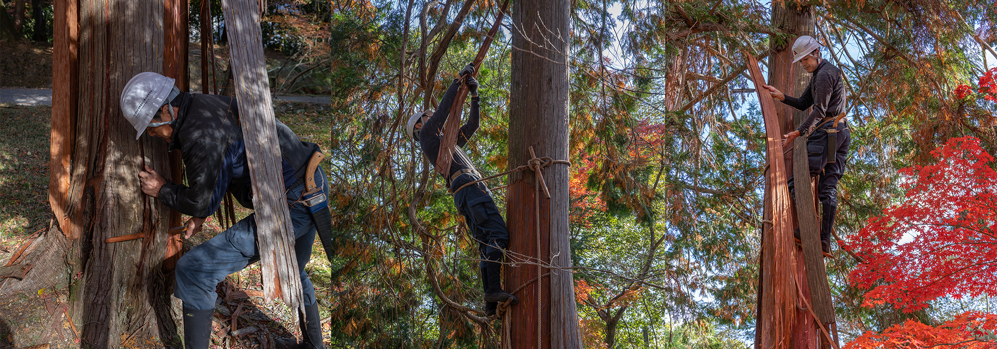 “扁柏樹皮葺頂”歷經千年以上支撐著日本傳統建築。將作為屋頂材料的檜皮,不損傷樹木,認真地採集的專業職位被稱為“原皮師”。