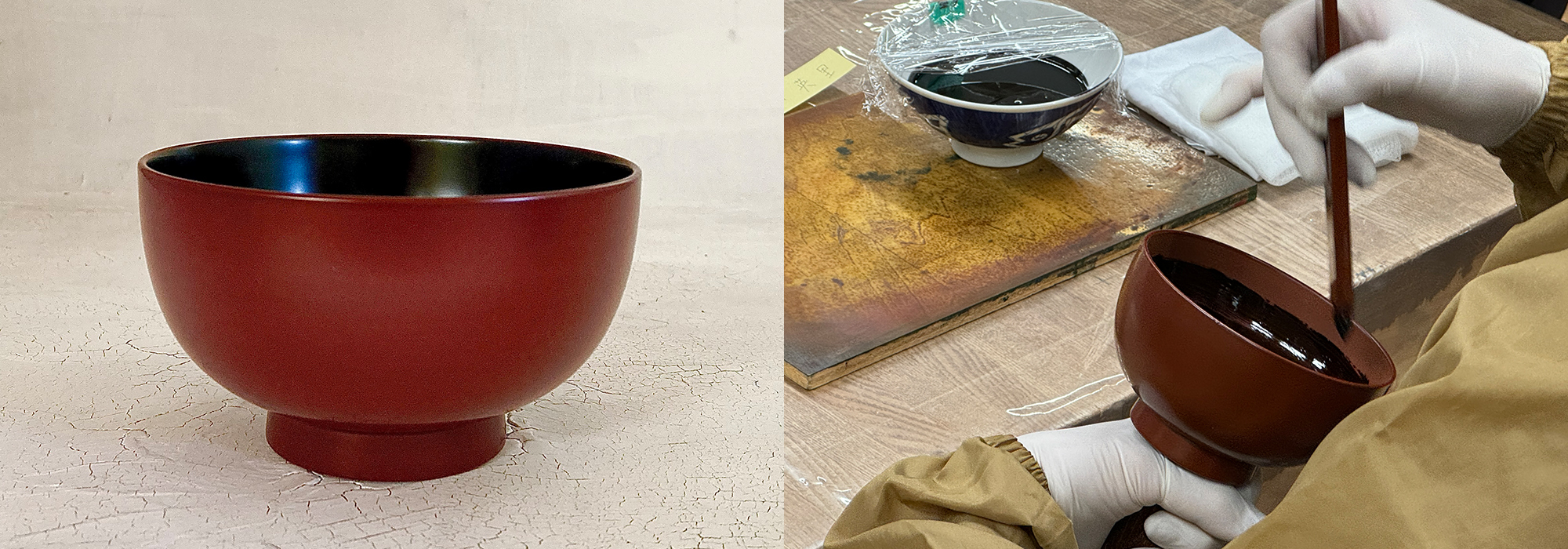 ②在小碗內側使用淨法寺漆進行最後塗漆(碗外側是從事先完成的狀態開始)。