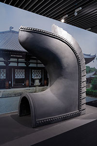 在入口大廳迎接的是姬路城大天守的獸頭瓦。高度190cm,重量300kg的實物大小,特別展示了姬路城大天守的平成大修理(2009年10月~2015年3月)時製作的東西。