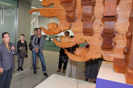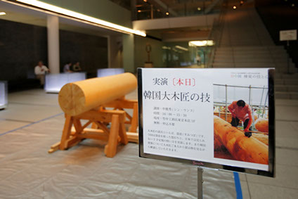 首先對入口展示的申棟梁的代表作、救仁寺大祖師殿的實際尺寸大組物模型進行了解說。我們採訪了南韓建築的組裝形式、設計、模型中使用的樹齡超過200年的赤松。