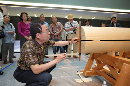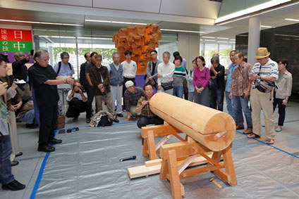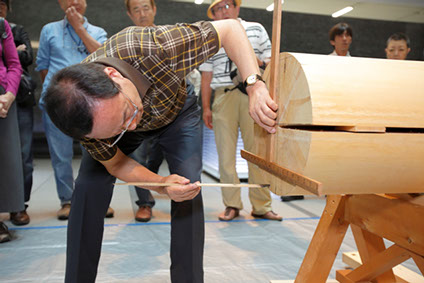 接下來是表演。把準備好的圓木比作柱子,上下進行塗墨。墨付是要看清處理樹木的性質,在適當的木材範圍內使用木材的能力,熟悉建築的構造,需要能馬上掌握部件尺寸的能力,所以可以從副棟梁開始進行。