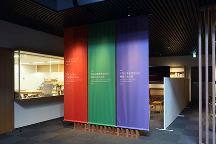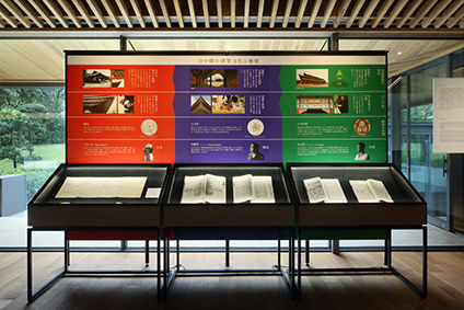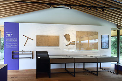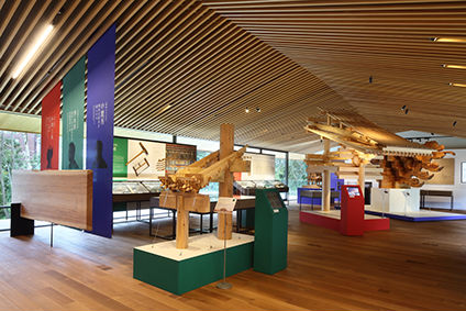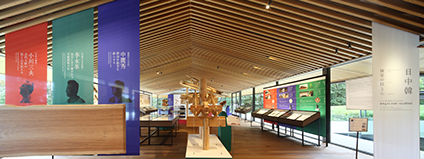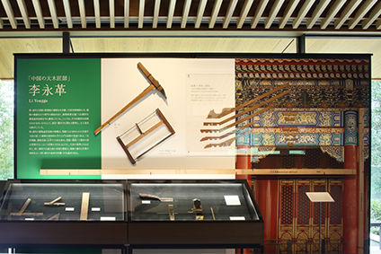 是前奏。面板緊湊地解說了中日韓的建築文化和棟梁的特徵。箱子內是與中國、南韓的宮殿技術相關的書籍和日本的木匠技術書等文獻展示。
