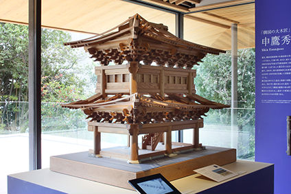 是日本專櫃。中央是藥師寺東院堂的二分之一縮尺模型。可以看出絲柏的質感和精致的完成技術,以及支撐著深屋檐的小屋後面的工夫。