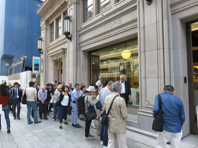 最初的參觀地是2013~15年進行了整修工程的明治屋京橋大廈(1933年竣工)。首先在清水建設總公司大樓的大廳裡使用幻燈片介紹了概要,移動到現場參觀了外觀。