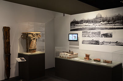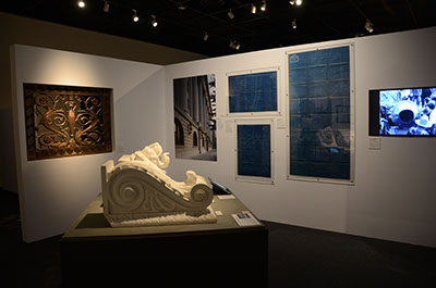 第一章是“建築的文明開化”。介紹了近代建築的先驅二代清水喜助的擬洋式建築等。右手邊能看到的是奇蹟般地留存至今的匯兌銀行三井組的柱頭。建築物雖然破天荒,但柱頭卻做得很好。