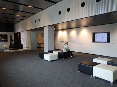 在展覽室前的大廳裡,放映了珍貴的建設工程的記錄影像。除了明治生命館、大阪煤氣大樓之外,還追加了“建造明治建築的人們-康德爾老師和四個弟子-”的影像。左邊最裡面看到的是只在東京會場展示的鹿鳴館樓梯。這是鹿鳴館解體時被截取並保存在東京大學的珍貴資料。