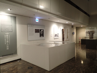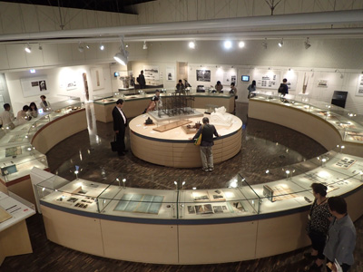 是展覽室的樣子。以圓形展示櫃為中心排列著各種資料。中央的展示台上設置了大型模型,周圍的牆面上設置了解說板。