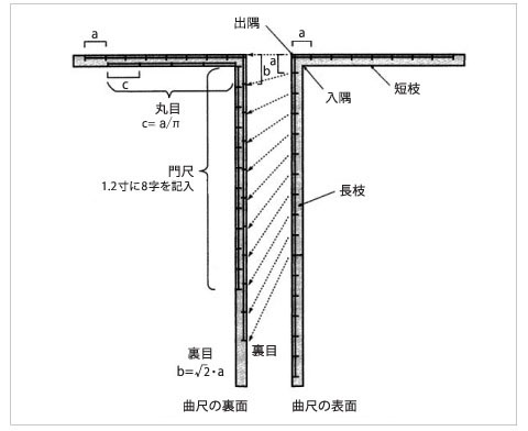 曲尺是利用這些刻度和形狀,量測物品的長度和角度等,在部件上塗墨時使用的道具。據說對於木匠來說,因為是工作上不可缺少的道具,所以懷著敬意來處理的,如果想在現場踩的話就立刻被怒吼了。