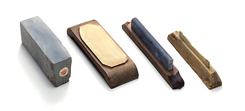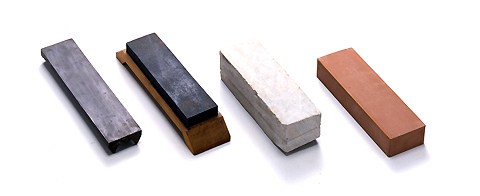 各種磨工具從左邊開始天然中砥,天然仕上磨刀,曲面用磨刀石2點