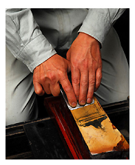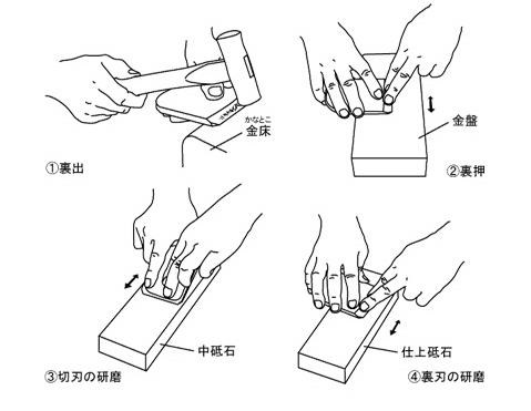 另外,用金盤和金剛砂將刨子切成平滑的刀刃背面,這叫做刨子的背面推(2)。在背面押的過程中,如果背面刀尖部分不均等撞到金盤上,則進行背出。