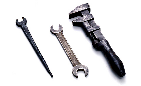 左起單口扳手,雙口扳手,拉切特扳手,馬達扳手,蒙基倫奇